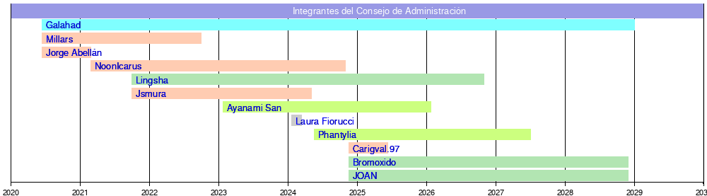 bar:Phantylia color:asesor from:21/05/2024 till:05/07/2027 text:"[[m:User:Phantylia|Phantylia]]" | bar:Phantylia color:asesor from:21/05/2024 till:05/07/2027 text:"[[m:User:Phantylia|Phantylia]]" | ||